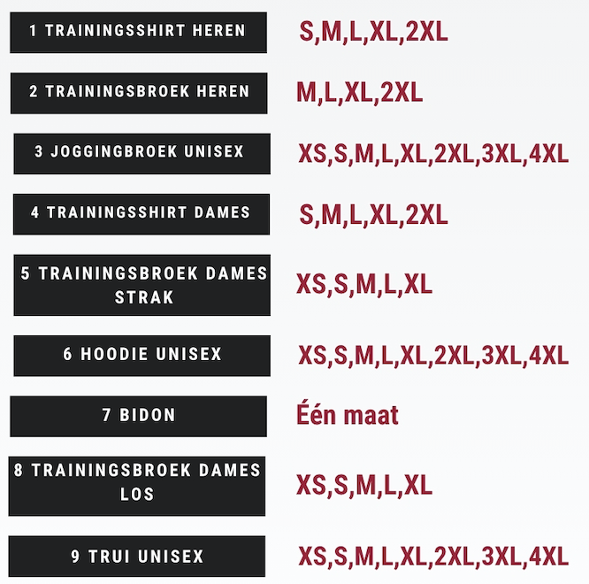 Onze eigen kledinglijn met verschillende maten per item.