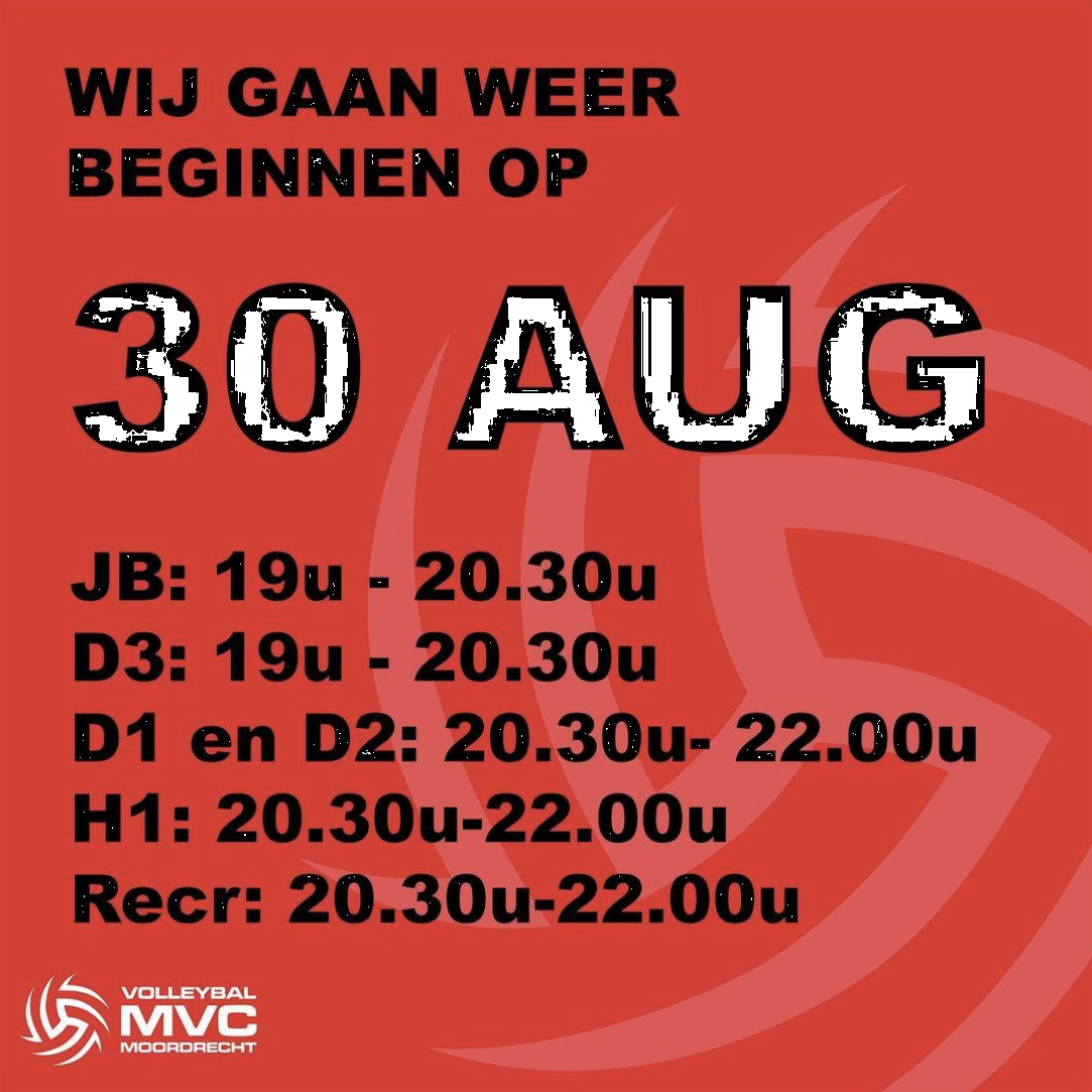 De zomervakantie is voor de meesten bijna voorbij en dat wil zeggen dat wij weer gaan beginnen met een nieuw seizoen volleybal. Wij gaan woensdag 1 september starten met de trainingen. Hieronder staan de trainingstijden op de woensdagen als er geen wedstrijden zijn.